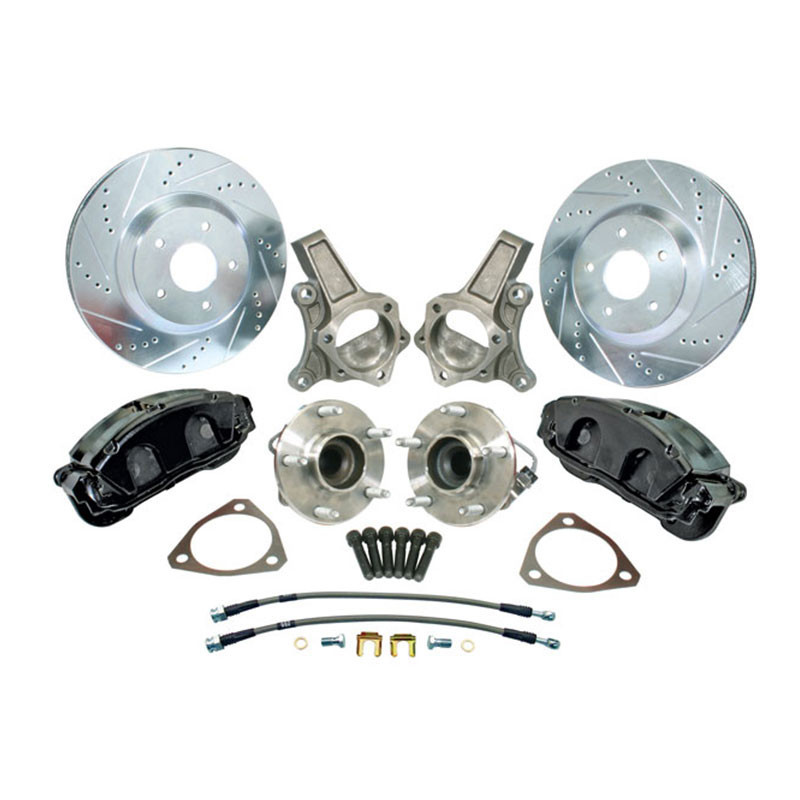 This 1967-1969 Camaro big brake kit utilizes brand new Corvette C5 style stock height spindles made just for the Camaro. Working in conjunction with aftermarket control arms the raised upper ball joint position gives a better camber change though the suspension travel. On the 67-69 cars you can reuse your original factory steering arms! This kit includes:C5 Corvette style spindlesLoaded black powder coated calipersRotorsHubs & bearingsStainless flex hosesBolts, brackets, and hardware necessary to complete the job!