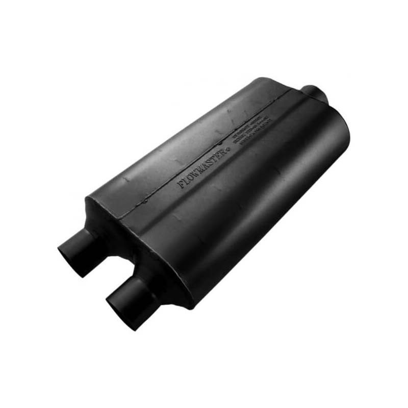 The Super 50 series muffler is a larger version of Flowmaster's 50 series Delta Flow muffler. Originally designed for trucks and SUV's, it is also well suited to muscle car and high performance applications. In addition, the larger case size significantly reduces interior resonance and provides a deep, rich tone along with mileage and power gains. Constructed of 16 gauge aluminized steel and fully MIG welded for maximum durability.Features:Improved Horsepower, Torque and Engine EfficiencyExcellent choice for large displacement vehiclesMinimal interior resonanceMild to stock exterior exhaust toneSpecifications:Body Height (in): 5Body Length (in): 17Body Width (in): 10Fitment: UniversalInlet Connection Type: Pipe ConnectionInlet Diameter (in): 2.25Inlet Position: DualMaterial: Aluminized SteelMount Type: Uses New Hangers (Not Included)Muffler Series: Super 50 SeriesMuffler Type: ReflectionOutlet Connection Type: Pipe ConnectionOutlet Diameter (in): 3Outlet Position: CenterOverall Length (in): 23Shape: OvalSound Level: Mild Sound