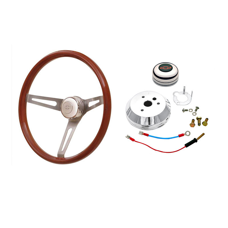 Upgrade your haggard, original steering wheel with this exclusive GT Performance GT3 Retro light wood steering wheel kit, including everything you'll need to make the swap on early GM columns. These kits include the following:Steering Wheel 36-5457: Inspired by GM Pony and Muscle Cars of the 60's and 70's, this GT Retro wheel is the perfect match for your Camaro. This wheel features 304 stainless steel brushed spokes with a slot design centered on each spoke. GT polishes the edges of each spoke and fully brush the back of the spokes as well. The genuine wood rim with sculpted finger grips has a beautiful hand rubbed light walnut stain finish and a unique slight V-shape grip that just feels amazing in your hands. In addition, it is sealed with a polyurethane clear coat that protects the wood and gives it a beautiful gloss finish. Providing the look, feel, and vibe of the classic wheels of yesteryear. Diameter: 15 inches. Dish: 4 inches.Horn Button 11-1022: Set off your Camaro's steering wheel with a first class colored emblem! This colored Chevy Bowtie emblem GT Performance horn button is beautifully polished and will highlight any GT3 Wheel with style. GT3 Billet Horn Buttons are machined from 6061 Aluminum and available in polished finish. It is secured using a unique 'Sure-Lock' O-ring design on a billet base which ensures that your horn button won't pop off in the middle of the night! Diameter: 3 inches. Height: 1.5 inches.Installation Hub 10-5002: Designed for installing GT3 bolt pattern steering wheels on early GM columns. These polished installation hubs are CNC machined from 6061 billet aluminum. Grade 8 Hardware is provided. They feature a one piece design for easy installation. Step by step illustrated instructions are included. This installation hub has a three bolt mounting pattern and is interchangeable with any standard three bolt steering wheel.