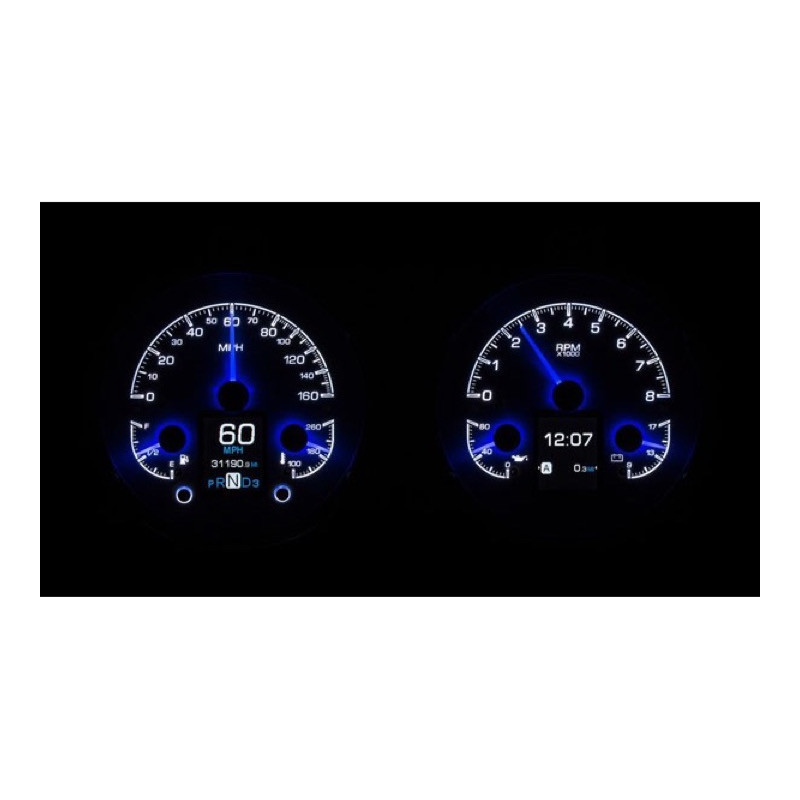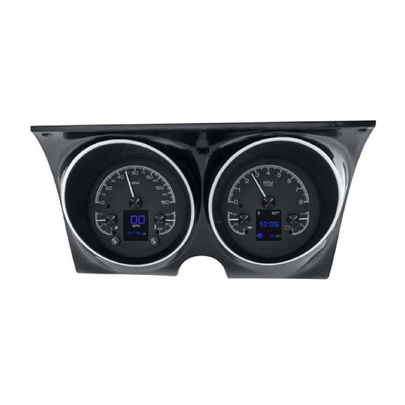 Released three years after Mustang but in the lead ever since, Camaro aims to please. 1967-1968 Chevy F-bodies make excellent drag cars, corner carvers, even lowriders. Any way you slice it, this instrument package makes the most of the dual-round gauge cluster. Each opening features three analog gauges snuggled up to a full-color TFT display. Summon just about any bit of information on the dual screens using integrated, capacitive touch buttons.Available with your choice of black or silver alloy gauge-face styling, each HDX system allows the user to select independent illumination colors for the gauge readings and needles, as well as the message centers. Calibration and personal settings are manipulated with the built-in, capacitive touch buttons, or the available Bluetooth app for Apple and Android devices. Each needle hub is black nickel plated spun-aluminum to match the buttons. All HDX instrument systems feature dead-faced indicators (turn signals, high beam, check engine, cruise control, parking brake, plus two user-definable), and a red, settable warning light for each gauge. With our central control box, installation is greatly simplified with vehicle harness sourced signals and supplied, solid state sending units connecting cleanly to their respective terminal.Features:Included Sensors:Water Temperature: 1/8 in. NPT, ground isolated sensor with a 10ft harnessOil Pressure: 1/8 in. NPT solid state sensor with a 10ft harnessCable Driven Speed Sensor/Generator: Replaces GM style speedometer cables with a 10ft harnessBushings: Each kit comes with 1/8 inch to 1/4 inch, 3/8 inch and 1/2 inch NPT bushings along with bushings for 12mm and 16mm x 1.5 threadsCalibration & Use:Pushbutton: All HDX series instrument systems include LED lit onboard capacitive touch pushbuttons through the gauge face. These pushbuttons provide quick and consistent access to all functions, either in driving mode or while in the setup menu. Button press feedback is available through the TFT message center, or through the included buzzer. Additionally, remote mounted switches can be wired into the HDX system if this proves more accessible based upon seating position. The HDX series can also be completely configured through the Bluetooth app, suitable to Android and Apple devices. Using your existing tablet or smart phone, download the free app, sync your device to the HDX system, and enjoy quick and convenient menu navigation and real time gauge readouts for diagnostic use or secondary displayCalibration: All calibration settings are handled through onboard capacitive touch switches or the remote Bluetooth app. While many calibration settings exist, the speedometer and fuel level are completed in most cases (unless GPS-50-2 is used, negating the need to calibrate the speedometer) through a few taps of the pushbuttons and a short drive of the vehicle.