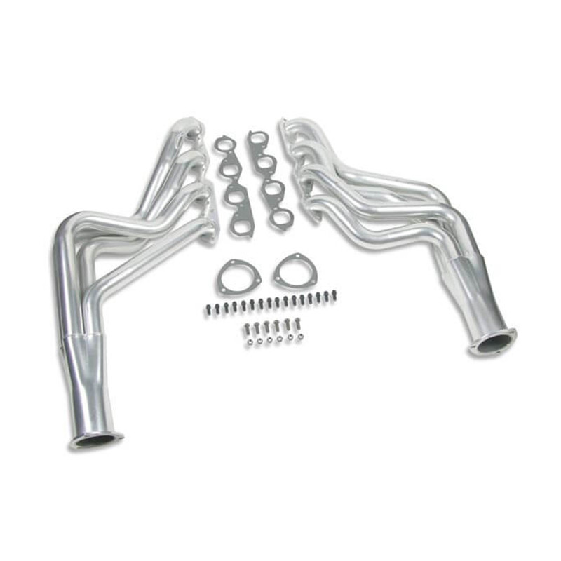 This exclusive proprietary Silver ceramic coating offers the nostalgic look of the past as well as the aggressive look of a modern high-tech build. It also offers a more refined texture and appearance than is possible from painted finishes. With a satin sheen it has a unique look of its own and in addition to providing a more menacing look it also provides all the corrosion resistance of traditional silver ceramic.The ceramic coating also provides improved thermal resistance as compared to traditional silver ceramic (1700 deg F vs. 1300 deg F) making it highly recommended for supercharged or nitrous applications as well as for reduced under-hood temperatures.Features:Provides unique styling enhancement that is equally pleasing in either a nostalgic retro application or a modern hi-tech build. As this coating is not burnished after its application, the surface appearance is more consistent than that of a silver ceramicIncreased corrosion protection ensures long service life and maintained appearance of investmentHigh-efficiency thermal properties limit heat migration through the header assembly, which in turn lowers under-hood temperatures for more performanceProvides a higher heat tolerance threshold than available from silver ceramics (ours or any of our competitors) and is therefore recommended for any applications producing elevated exhaust gas temperatures, such as when using superchargers and/or nitrousFormulated to withstand extreme temperatures (stability rating is 1700 deg F vs 1300 deg F on silver ceramic) without discoloration and maintains excellent adhesion even after repeated thermal cyclingWorks with factory power steering, power brakes and air conditioningSpecifications:Collector Diameter: 3.50 inchHeader Finish: Silver CeramicHeader Style: Long TubePrimary Tube Dia.: 2 inchTube Material: Mild Steel