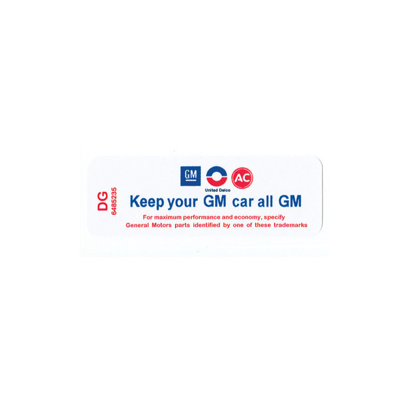 This the correct side air cleaner decal which says, Keep your GM car all GM for all 1967-1969, 1967-1969, or 1967-1969 Camaros with cowl induction.