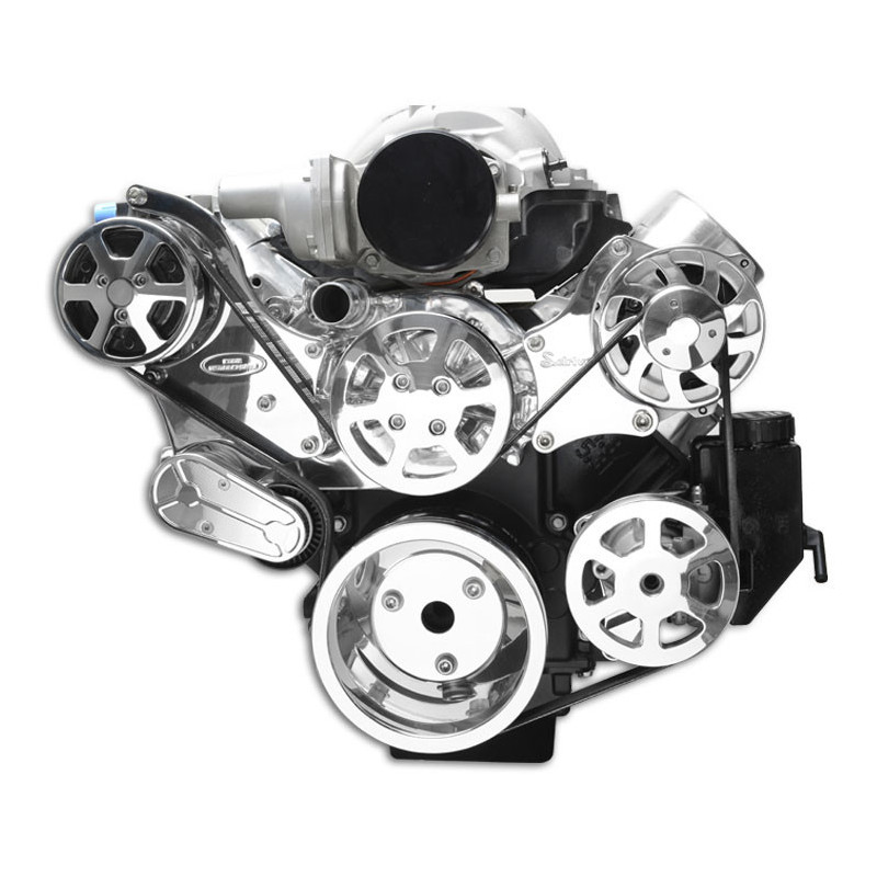 S-Drive + Eight rib pulley systems for Camaro have a contact patch that is 33% wider than a standard six rib belt, the eight rib improves belt traction which limits slippage in higher horsepower applications and can handle increased torque loads of 33%. The larger eight rib belt also greatly reduces the chances of Span Vibration(belt whip/belt waves) which will have an improved life. The drive system's brackets and pulleys are CNC machined from high quality aluminum. Serpentine Drive Plus pulley systems also include all of the necessary stainless steel fasteners as well as the highest quality, name-brand components including Edelbrock/Tuff Stuff water pumps, Powermaster alternators, Gates tensioner and serpentine belts, Sanden style A/C compressors, and Maval power steering pumps. Complete system with air conditioning, 140 amp alternator, Aluminum Water pump, and a plastic attached Power Steering reservoir. Clear anodized (matte silver sheen) finish.