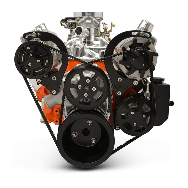 Eddie Motorsports' V Drive v-belt pulley kits for Camaro include everything to accessorize your Big Block Chevy engine. Kits come complete with all of the necessary precision CNC machined billet aluminum brackets & pulleys, which are made in the USA, as well as high quality, name brand components; Tuff Stuff aluminum water pump, Sanden compact AC compressor, Maval power steering pump with attached aluminum reservoir, Powermaster 170 amp alternator. Matte Black Fusioncoat Finish.