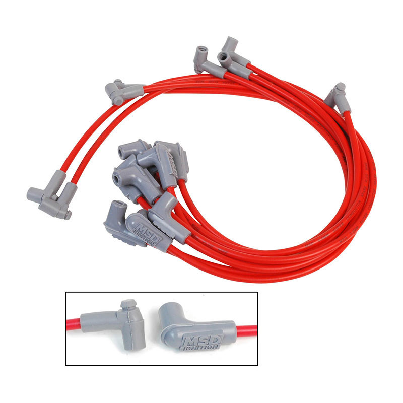 Engineered from the inside out, the 8.5 offers everything you have ever wanted in a wire; incredibly low resistance without electronic interference! In a single 12 inch length of Super Conductor Wire there is only 40 - 50 ohms of resistance! That is the lowest resistance of any helically wound wire. To accomplish this, we use a copper alloy conductor due to it's great voltage carrying capabilities. The low resistance results in less loss in spark energy so more reaches the spark plug. The conductor is wound extremely tight around a special center core. So tight in fact, that there is over 40 feet of conductor wrapped into a single foot of plug wire. This winding procedure, combined with a ferro-magnetic impregnated center core, produces an extremely effective Electro Magnetic Interference (EMI) 'choke'. This choke, or suppression capability, keeps the EMI inside the wire where it cannot interfere with other electronics on your vehicle. The outer sleeve that surrounds the conductor assembly is just as impressive. A proprietary blend of silicone and synthetic material produce a sleeve that is highly resistant to high heat as well as abrasion and tears. The MSD's 8.5mm spark plug terminals feature Dual Crimp terminals. As the name implies, the terminals feature two crimps; one for the sleeve of the wire and another separate crimp to grasp the conductor.Features:Custom fit for make and model listed.Wires are precut to exact specificationsBolt-on performance
