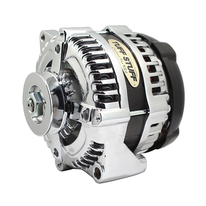 These MAX AMP alternators provide up to 165 Amps at idle - 225 Amps at full charge! The 7866 Series alternators are the same form factor as the Delco CS130 1967-1994 to 1967-1994 GM cars and light trucks with a left-offset 5.25 inch hole spacing.. Available in chrome plated, black powder coat or Factory Cast PLUS+ finishes. For safe operation, these alternators require a #4- or #2-gauge charge wire, depending on wire length.Tuff Stuff alternators are quality built in USA from 100% new components, are tested to far exceed OEM specifications and carry a one-year limited warranty.Features:225 MAX AMP; 165 Idle Amp1-Groove1-WireChrome PlatedInternal Voltage RegulatorSame Form Factor As Delco CS130 7861Requires A No.4 Or No.2 Gauge Charge Wire; Depending On Wire Length