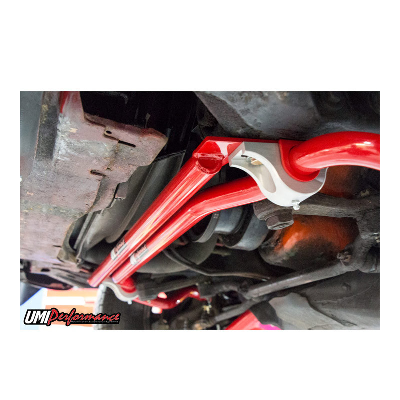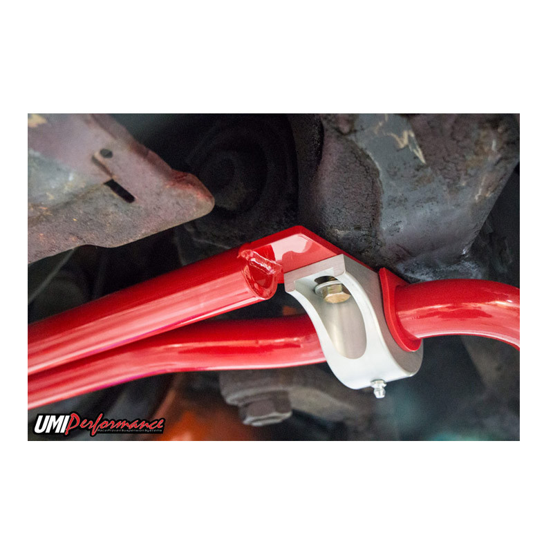 BOLTS IN PLACE USING OEM HARDWARE AND CAN BE USED WITH OEM SWAY BAR BUSHINGS AND AFTERMARKET POLY MOUNTS. TESTED WITH FACTORY SWAY BARS AND UMI SWAY BARS.