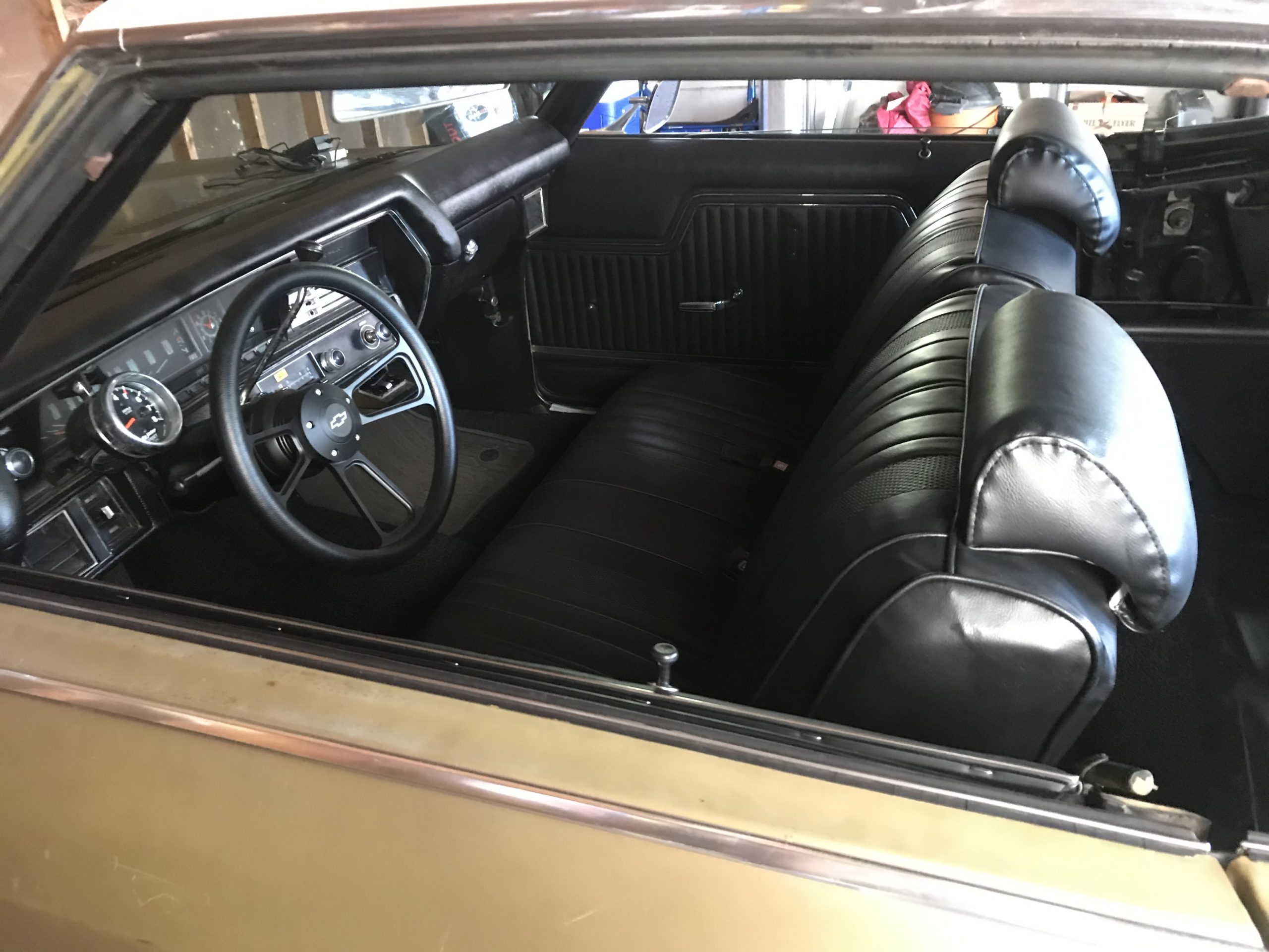 Doing a full interior restoration with bench seats and carpet he did himself. 4 wheel disc brake conversion, full-suspension coil overs all around sway bars front and rear. New wheels, tires, paint, and bodywork on the 1970 Chevelle.
