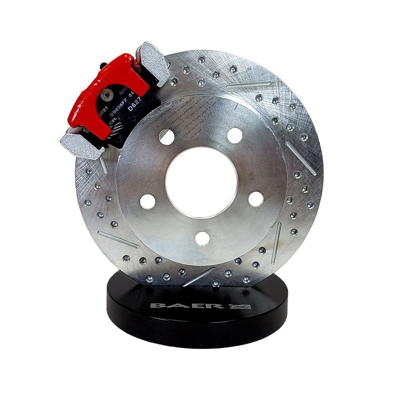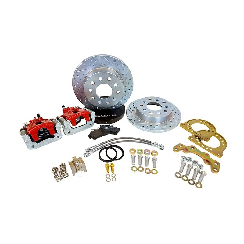 If you are looking for some serious stopping power for your 1964-1972 A-F-body, Baer brakes has you covered! This system features a single piston, integral park brake caliper mounted to a 10.50 inch, 1-piece slot, dimpled and zinc plated rotor. The caliper comes with a red powder coated finish, includes dust/weather seal and uses the popular D627 pad type. The system includes calipers, rotors, brackets, hardware, stainless braided brake hoses and fittings. The Baer Classic system is a cost effective, full feature drum to disc conversions and fits most 14 inch or larger wheels. Rotor Style:10.5 X .504 Inch 1-piecePiston Count: 2 PistonPad Type:(D412R)Minimum Wheel Size:14 inch or largerIncludes:Modified spindles, Calipers, Brake pads, Rotor�s, Premium Bearings, Dust caps, Brackets, Stainless braided brake hoses and mounting hardware (Assembly Required)Notes:Designed to be used with GM small 10/12 bolt rear ends with C-clips, C-clip eliminators or bearing on axle (BOP). For vehicles with NON-Staggered rear shocks. System has 5x4.5 inch and 5x4.75 inch bolt pattern. 15/16 inch master cylinder recommended. Adjustable proportioning valve recommended.Applications:1964-1972 A-F-body Kit Features:Powder Coated Red CalipersModern Brakes For Small WheelsStainless Braided Brake HosesSlot, Drill, Zinc Plated Rotors2-piston, Pad Guided DesignPowder Coated Red with Black LogoUses correct banjo style fittings, Baer does not use any pipe threadUses Common FMSI D412 Pad100% MADE IN USA with US sourced material>
