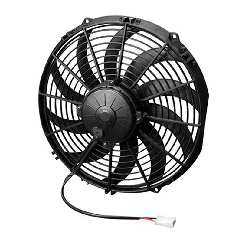SPAL electric fans and accessories are built to meet the most rigorous cooling requirements needed for today's high performance automotive applications. SPAL fans are durable, reliable, and the choice of many NASCAR teams. SPAL offers a variety of high performance fans perfect for your motorcycle, ATV, automotive, and/or oil cooler applications. Manufactured from sturdy plastic, individually balanced for long service life, and most feature a fully sealed waterproof/dust proof motor for reliable performance in the most extreme conditions. SPAL fans can be mounted to any radiator with universal brackets and shrouds.Key Features:1381 CFMPush Fan DesignCurved Style BladesLow Profile Motor DesignHeight; 13.19inWidth; 12.56inDepth; 3.44inFeatures fully sealed motor to IP68 standards making them waterproof/dust proof12V