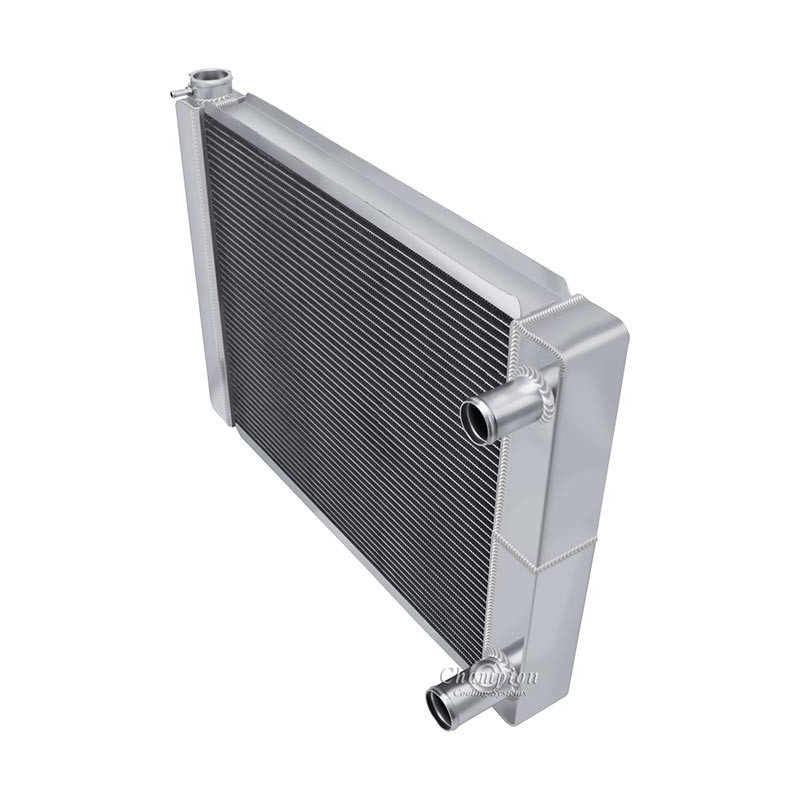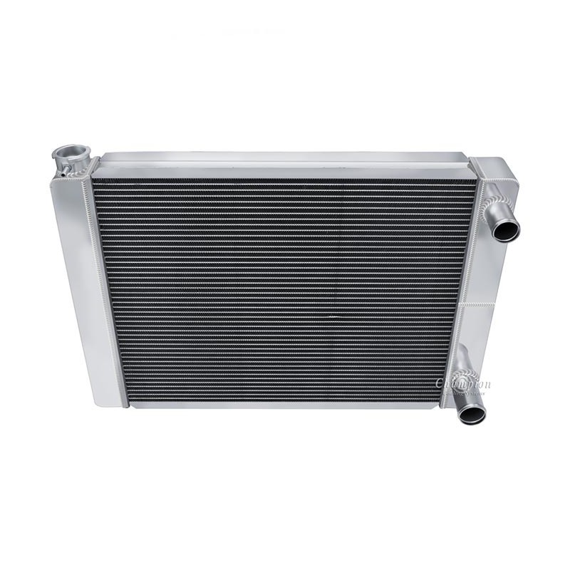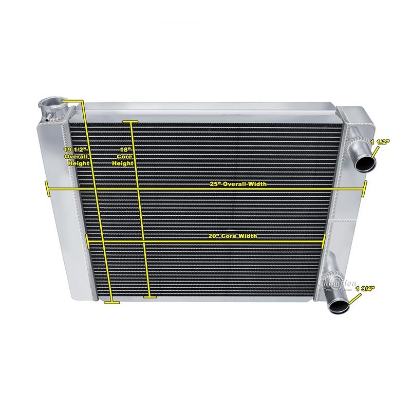Champion's Universal Crossflow Radiators . These are 3-Tube Cores designed for the Do-It-Yourselfer who can create their own mounting system in their vehicle. These are 'Race Ready', and are made without provisions for a Drain Petcock or a Transmission Cooler. Three Hose Configurations to fit a multitude of engine applications double-pass design. Great for the track or the street in a very budget-friendly pricing package. These include our standard polish and a radiator cap, as well as a vent fitting on the filler neck.IncludesCORE DIM (H x W): 18 x 20OVERALL (H x W): 19 1/4 x 25I 3 ROW CORE THICKNESS: 2 1/4 Inch 3 ROW TANK THICKNESS: 3 Inch HOSE LOCATIONS: In - Passenger / Out - PassengerHOSE FITTINGS: In -1 1/2 Inch - Out -1 3/4 InchTRANS COOLER: Not availableMOUNTING TYPE: Universal fit saddle mount)3 Row - Three Rows of 5/8 Inch Tubes = Approx. 600-800+ Horsepower Cooling Capacity.