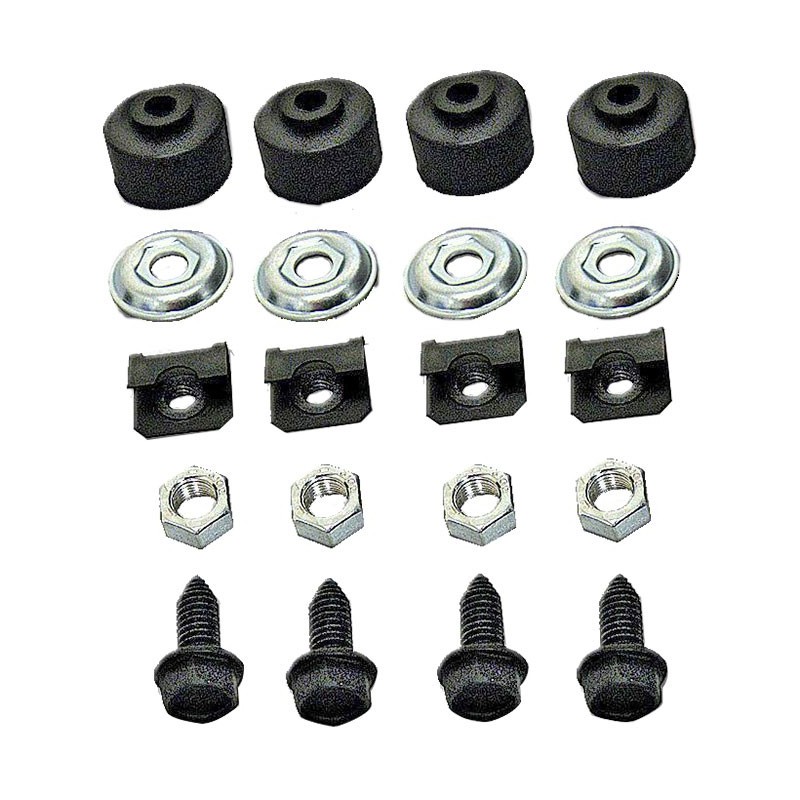 1964-1977 Chevelle complete OE correct front shock mounting kit complete with (4) mounting clips, (4) bolts with washers, (4) rubber bushings with retaining washers , and (4) nuts. The bushings tend to deteriorate over time causing clunks bangs and just plain old poor handling, the clips almost always rust up solid making this kit a must to keep your front shocks working properly! When replacing or just removing and reinstalling your front shocks this kit makes the job easy!