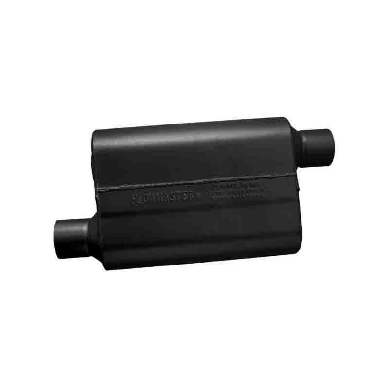 This two chamber design incorporates Flowmaster's patented Delta Flow technology. The Delta deflectors generate increased scavenging for better performance and reduced interior sound. Milder exterior tone and reduced interior resonance over Original 40 series. Constructed of 16 gauge aluminized steel and fully MIG welded for maximum durability.Features:No internal packing to blowoutExcellent Street/Strip and Off Road applicationRace proven patented Delta Flow technologyDurable fully welded 16 gauge aluminized steelSpecifications:Body Height (in): 4Body Length (in): 13Body Width (in): 9.75Fitment: UniversalInlet Connection Type: Pipe ConnectionInlet Diameter (in): 2.5Inlet Position: OffsetMaterial: Aluminized SteelMount Type: Uses New Hangers (Not Included)Muffler Series: 40 Series Delta FlowMuffler Type: ReflectionOutlet Connection Type: Pipe ConnectionOutlet Diameter (in): 2.5Outlet Position: OffsetOverall Length (in): 19Shape: OvalSound Level: Aggressive Sound