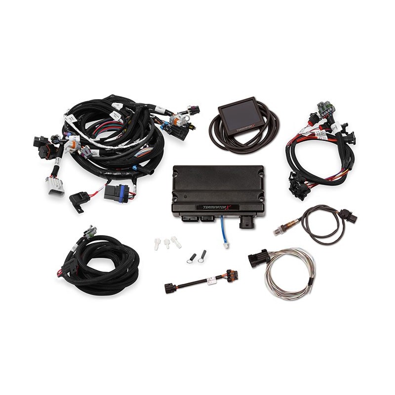 Take control of your LS engine with Holley EFI Terminator X! Don't settle for a junkyard ECU with a cumbersome tuning interface when you can have complete control of your engine, self-learning fuel strategies and the proven, race-winning technology of Holley EFI at a budget-friendly price! Holley EFI Terminator X features real-time fuel learn, high impedance injector drivers, an integrated 1bar MAP sensor, and 4 programmable inputs and outputs. The inputs and outputs are ideal for electric fans, boost control solenoids, progressive nitrous control, and much more. Holley EFI Terminator X comes fully loaded with base maps for common LS engine combinations to get you out of the garage and on the road/track fast. The 3.5 IN touch screen LCD handheld contains an easy to use calibration wizard as well as tuning and gauge display functions. Also included is Holley EFI's industry-leading, easy to use software suite that allows full laptop access for advanced users. Whether you are building a budget beater or a boosted race car, Holley EFI Terminator X has the features and technology you need at a price that won't break the bank!Features:For GM LS1/LS6 engines with 24x crank reluctor - with EV1 Injectors.Real-Time fuel map learn, takes the guess work out of tuning your base fuel table.High Impedance Injector Drivers will safely power most Stock LS injectors, and Holley EFI Injectors. Injector support chart provided in the instructions (Will not control Low Impedance Injectors)All of the new Holley EFI Terminator X systems utilize the Bosch LSU 4.9 wideband to relay AFR information to the ECU for accurate reading and precise tuning control.On-Board 1bar MAP sensor, is perfect for N/A or Nitrous engine combos. If your combination requires a 2+Bar, we recommend GM 12592525, and our adapter part number 558-416.MAP Sensor vacuum hose adapters (1/8th – ¼ and 3/16ths)4 Inputs – 12v, Ground, 5v, and Frequency, for things such as additional pressure sensors, or activation triggers for nitrous activation, or a trans brakeBoost Control – Boost vs Time, Boost vs Gear, Boost vs RPM, Boost vs Speed, Boost SafetiesNitrous Control – Single Channel of Wet or Dry, Progressive or Non-Progressive, Rich/Lean Safeties, and target Closed Loop AFRAdvanced Tables – 4x 1D Tables, 1x 1D per Gear Table, 4x 2D Tables, 1x 2D per Gear Table, can be used for any custom tables you can dream up, such as Flex Fuel Sensor Offset Table, or a custom fuel or oil pressure safety!On-Board Diagnostic LEDS for: ECU Power – Engine Run – Wideband Status – TPS Calibration – Crank Signal –Cam Signal. Allow you to identify any Critical engine issues at a glanceThe included 3.5 IN Touchscreen Handheld contains a calibration wizard, that allows you to quickly build a base tune for any LS engine. Additionally the handheld provides internal data-logging and a fully customizable gauge display.The compact ECU size allows you to mount it virtually anywhere. Remember, diagnostic LEDS must face up!Plug and play compatible with more Holley EFI accessories such as; analog style gauges, shift lights, various modules, and coming soon, 12.3" digital dash support!Free EFI Tuning Software for complete control of your Holley EFI Terminator X power plantIncludes: 24x LS Engine Main Harness - EV1 Injector Harness - Holley EFI Terminator X ECU - ECU Main Power Harness - Bosch LSU 4.9 Wideband Oxygen Sensor - Input/Output Harness - and assorted vacuum adapters.