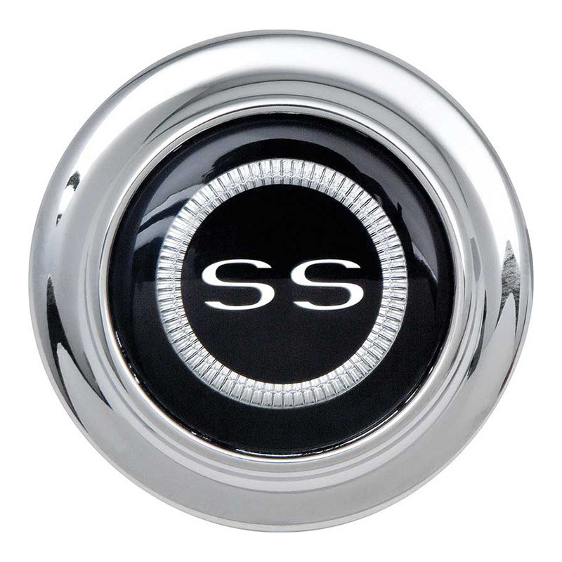 1967 Chevelle reproduction die-cast horn cap unit designed for SS models. Each horn cap is designed to replicate the original in quality and fitment. Features bright chrome plated finish and includes the SS emblem in the center of the cap. Center section is injection molded with authentic silver SS logo. For SS models with deluxe steering wheels.