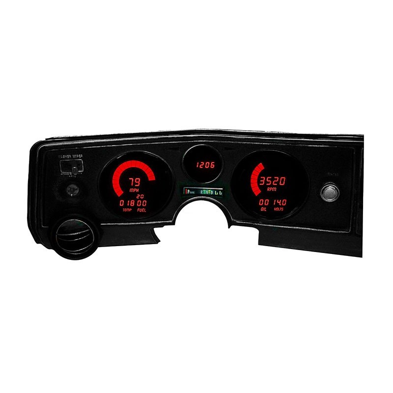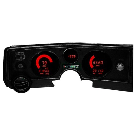 Feel the wind in your hair riding in your 1969 Chevelle with a state-of-the-art LED Digital Replacement Gauge Panel from Intellitronix. This dash comes with direct fit printed circuit boards, custom fit smoked plexiglass faceplate, universal water temperature S8013, oil pressure S8434, and speedometer S9013 sending units including sender and sensor for vehicles without electronic transmission or cruise control, and instructions for installation. Features:Speedometer reads up to 255 mph and includes odometer, trip meter, one button calibration, 0-60 time, _ mile elapsed time and high-speed recall.Tachometer displays 0-9999 RPM in 100, 10, or 1 RPM increments (ex. 9900, 9990, 9999). Fully programmable for 1-2-4-6-8-10-12-cylinder engines.Water Temperature displays a range of 18-255°F.Oil Pressure shows a range of 0-99 PSI.Voltmeter displays 7.0-18.0 volts range. No sending unit requiredFuel Level reads 0-99% range in 1% increments. User programmable to work with Ford, GM, Chrysler, VDO, and aftermarket 240-33 ohm industry standard fuel senders.The panel features turn signals, high beam indicators and parking brake.