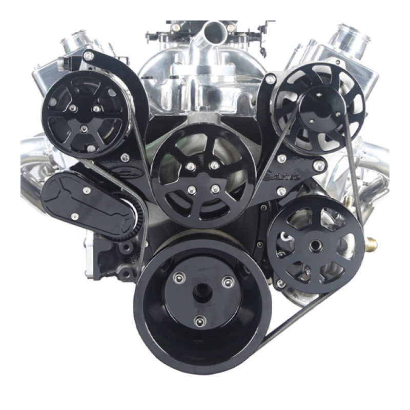 S-Drive + Eight rib pulley systems for Chevelle have a contact patch that is 33% wider than a standard six rib belt, the eight rib improves belt traction which limits slippage in higher horsepower applications and can handle increased torque loads of 33%. The larger eight rib belt also greatly reduces the chances of Span Vibration(belt whip/belt waves) which will have an improved life. The drive system's brackets and pulleys are CNC machined from high quality aluminum. Serpentine Drive Plus pulley systems also include all of the necessary stainless steel fasteners as well as the highest quality, name-brand components including Edelbrock/Tuff Stuff water pumps, Powermaster alternators, Gates tensioner and serpentine belts, Sanden style A/C compressors, and Maval power steering pumps. Complete system with air conditioning, 140 amp alternator, Aluminum Water pump, and a Maval power steering pump for use with remote reservoir (sold separately). Gloss black anodized finish.