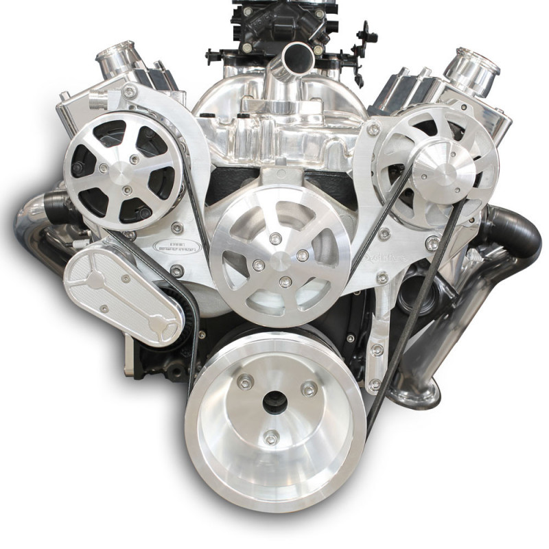 S-Drive + Eight rib pulley systems for Chevelle have a contact patch that is 33% wider than a standard six rib belt, the eight rib improves belt traction which limits slippage in higher horsepower applications and can handle increased torque loads of 33%. The larger eight rib belt also greatly reduces the chances of Span Vibration(belt whip/belt waves) which will have an improved life. The drive system's brackets and pulleys are CNC machined from high quality aluminum. Serpentine Drive Plus pulley systems also include all of the necessary stainless steel fasteners as well as the highest quality, name-brand components including Edelbrock/Tuff Stuff water pumps, Powermaster alternators, Gates tensioner and serpentine belts, and Sanden style A/C compressors. Complete system with air conditioning, 140 amp alternator, Aluminum Water pump. This kit does not include power steering. Raw machined finish.