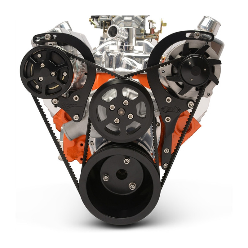 Eddie Motorsports' V Drive v-belt pulley kits for Chevelle include everything to accessorize your Small Block Chevy engine. Kits come complete with all of the necessary precision CNC machined billet aluminum brackets & pulleys, which are made in the USA, as well as high quality, brand name components; Tuff Stuff aluminum water pump, Sanden compact AC compressor, Powermaster 170 amp alternator. This kit does NOT include power steering. Matte Black Fusioncoat Finish.