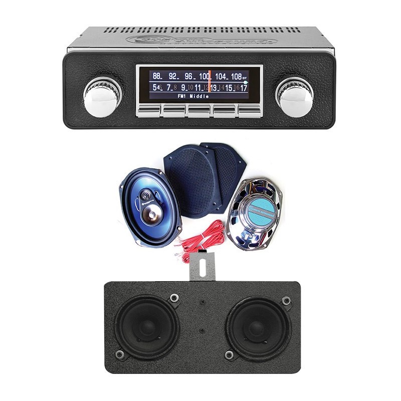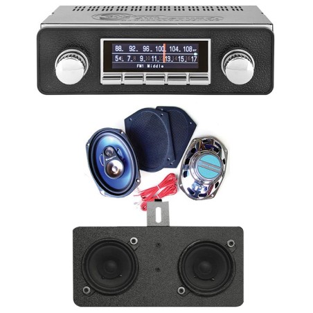 Crank up the tunes with Ground Up's exclusive Sound System Kits! Each kit comes with an in-dash radio, rear speakers, and dash speakers, making it easy to bundle and save while still looking and sounding great!Custom AutoSound's USA-850 is designed to provide the best in audio technology wrapped in a classic car stereo look. It will fit your stock dash without any modifications required. It has been designed with a bezel containing the manufacturer logo as well as large OEM style push buttons to compliment your dash. When it comes to electronics, the USA-850 boasts modern features like built-in Bluetooth (microphone included), answer calls and get Bluetooth streaming music from your Bluetooth capable phone or Bluetooth compatible device. A solid 300 watt peak power should be all the juice you need; however, the USA-850 also features a set of high output 6 volt RCA pre-outs, 4 channel RCA full range pre-outs, and 2 channel subwoofer RCA pre-outs. The 2 channel RCA auxiliary audio input provides versatility for options like satellite radio, iPod or any portable player you wish to use. Another great feature is that it comes with 4 programable screen options for you to customize the look of the radio. The AM/FM RDS PLL tuner shows station, song, and artist on the LCD display. For those of us committed to music collections on compact disc, the USA-850 fully controls the optional CD player.The USA-850 DigaDial™ virtual screen gives you your choice of 4 distinct and one- of-a- kind displays. Choose from a classic 60s style analog setting and watch as the red needle glides across the dial to tune to your favorite AM/FM radio stations. Or choose the RDS all digital display with station, song and artist information.The Custom AutoSound 3-way 6x9 inch rear speakers feature flat metal grilles with black finish. They can easily be painted to match your interior or left as is. They feature full chrome speaker baskets, 63mm Ferrite tweeters, and 36mm neodymium tweeters. 4 ohm, 16 oz. magnet, 67Hz - 20 kHz frequency response, sensitivity 93db.The Custom AutoSound dash speakers feature Kenwood quality upgrade replacement speakers for your original front in-dash speakers. These great quality speakers can handle up to 60 watts and are built and designed to fit directly under the dash including all correct mounting brackets and wiring. Each assembly includes two speakers.Kit Contains:(1) Custom AutoSound USA-850 AM/FM Stereo 300 Watts Chrome(1) Rear Speakers By Custom AutoSound(1) Dash Speaker