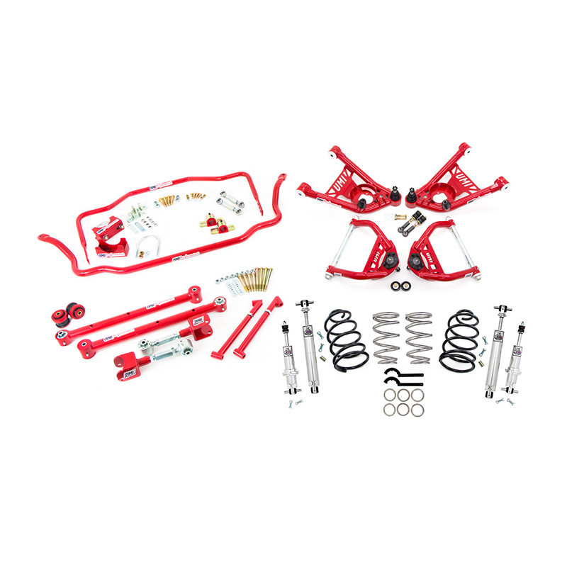 SMALL BLOCK MOTORS, PONTIAC 400 OR BIG BLOCK WITH ALUMINUM HEADS AND INTAKE TEND TO SIT LEVEL WITH THIS KIT. LIGHTWEIGHT LS MAY REQUIRE SPRING TRIMMING. AN ADDITIONAL 1/4 INCH FRONT END DROP MAY OCCUR ON VEHICLES WITH FULL WEIGHT BIG BLOCK ENGINES.