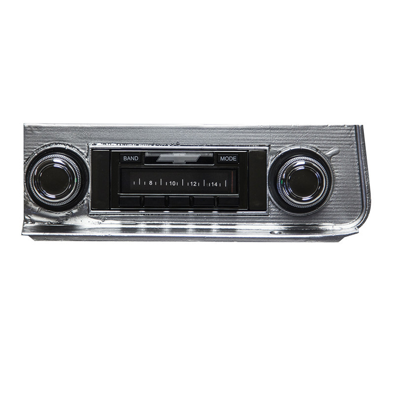 Custom AutoSound's USA-630 is designed to provide the best in audio technology wrapped in a classic car stereo look. It will fit your Chevelle's stock dash without any modifications required. It has been designed with a bezel containing the manufacturer logo as well as large OEM style push buttons to compliment your dash. When it comes to electronics, the USA-630 boasts modern features like a USB input for flash drives to play back MP3/WMA song files and a dock for your iPod. When connected to these devices, the radio's digital display will show artist, song, album titles, and allow song navigation through the radio itself. The USA-630 is compatible with the optional BLUKIT which enables Bluetooth music streaming from your enabled phone, as well as hands-free mobile calling through the vehicle's speakers & BLUKIT's built-in microphone. With 300 watts peak the radio provides plenty of power, but additionally contains four RCA preouts for optional amplifiers. It also comes with auxiliary inputs for satellite radio tuners, iPhones, or any portable player you may wish to use.Specifications:AM/FM Stereo300 Watts PeakiPod doc and control (Control your iPod from the buttons on the radio)Negative LCD display (Black background with white letters / numbers)Electronic Tuning and Volume ControlDigital EQLeft/Right Balance2 Channel RCA Auxiliary input for Satellite, etc. (cable included)4 Channel RCA Pre-outsUSA/Euro TunerRDS Tuner shows station/song/artist on LCD displayUSB Port for Flash Drive MP3/WMA PlaybackDirect CD-1 ControlAlpha Numeric Display for MP3/WMA/iPod filesLoudness compensation4-way FaderDigital Clock16 Presets (12FM/4AM)Separate Bass and TreblePower Antenna Lead