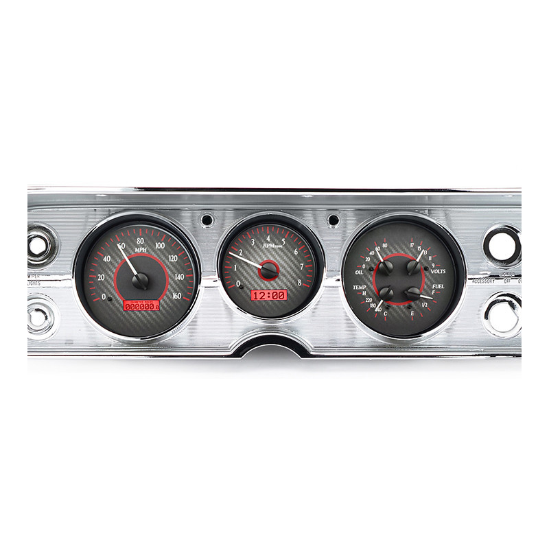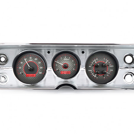 The new VHX Systems fit directly into the stock instrument bezel of a 1964-1965 and 1964-1965 Chevy Chevelle and Chevelle without modification, adding a wealth of features to this iconic vehicle. Fully lit needles, backlit faces, and highly visible LCD message centers are a few of the things that you can see which set the VHX Series apart from yesterday's traditional approach to instrumentation. A few of the features which you don't normally see are the micro-controlled precision stepper motors, solid state sensors for unparalleled accuracy, and user-customizable display feedback, all supported by an unrivaled limited lifetime warranty which has become the standard for Dakota Digital instrumentation systems . Completely engineered and manufactured in the USA, the VHX Series has completely revolutionized the instrumentation industry!Features:Analog Gauges:Speedometer : 0-160 MPHTachometer: 0-8000 RPMOil Pressure: 0-80 psiWater Temperature: 100-260 FahrenheitFuel Level: E, 1/4, 1/2, 3/4, FVoltmeter: 9-17 VDCLighting: Back lit technology is popular with performance instrumentation due to precise lighting allowing you to see what is truly important when you really need it at a quick glance. Each number, tick mark, annunciator, needle, indicator and digital message center is lit by a series of LEDs behind the gauge face.Digital Message Centers:Standard Displays: Odometer (one time user settable, million mile), Dual (A/B) Trip Meter (0-9,999.9), Clock (12 hour)Performance Meters: 0-60 MPH Timer, 1/4 Mile Time, 1/4 Mile End Speed (trap speed), High Speed Recall, High RPM RecallGauges: Speedometer (0-255 MPH/kmh), Tachometer (0-9,900 RPM), Oil Pressure (0-100 psi displayed in 1 psi increments), Water Temperature (100-300 degrees Fahrenheit displayed in 1 degree increments), Voltmeter (9-17 VDC), Fuel Level (0-99% full)Lighting: Auto-contrasting LCD display for optimal view in the brightest of sunlight, LED backlit at night to match/complete the look at nightBuilt-In Indicators:Turn SIgnalsHigh BeamCheck EngineParking BrakeCruise ControlGear Position (optional GSS-1964-1965 sensor required)4x4 (when vehicle is equipped)Wait to Start (when vehicle is equipped)Included Sensors:Water Temperature: 1/8 in. NPT, ground isolated sensor with a 10ft harnessOil Pressure: 1/8 in. NPT solid state sensor with a 10ft harnessCable Driven Speed Sensor/Generator: Replaces GM style speedometer cables with a 10ft harnessBushings: Each kit comes with 1/8 inch to 1/4 inch, 3/8 inch and 1/2 inch NPT bushings along with bushings for 12mm and 16mm x 1.5 threadsCalibration:Pushbutton: Dakota Digital instruments are programmed and operated by the push of a button. SImply mount the included pushbuttons supplied with your gauges in a convenient and easily accessible location. These buttons are used to calibrate your speedometer, set the cylinder count and fuel level gauge. Once properly configured, these same buttons are used to access the wealth of information located in the Digital Message Centers