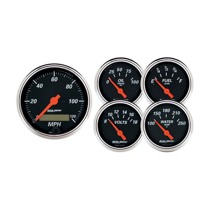 AutoMeter has brought together the most popular Cutlass gauges into a simple kit. The kit includes a speedometer, water temperature, oil pressure, fuel level, and voltmeter. All senders included where applicable.Features:Traditional incandescent lighting illuminates around the perimeter of the dialKit includes fuel level sender (240E/33F), oil pressure sender, water temperature sender, 2-wire hall effect speed sender that is compatible with GM/Chrysler applications (7/8in. - 18THD), sending unit adapters (1/4in., 3/8in., and 1/2in. NPT adapters), bulb and socket assemblies, red and green bulb covers, mounting hardware, and detailed instructions for installation.AutoMeter's race proven air-core electric instruments provide quick and accurate readings while keeping hazardous fluids outside of the vehicle12 and 16 volt compatible, compatible with nearly every street car or race car electrical systemSpeedometer has a simple push button, 2 mile drive calibration. No dip switches and can be reprogrammed at any time to accommodate changes in gear ratio or wheel and tire combination.Speedometer is compatible with most two wire sine wave and three wire hall effect vehicle speed sensors.Speedometer lit LCD odometer - capable of registering one-million miles with two resettable trip odometers