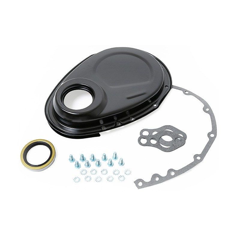 1978-1988 Cutlass black timing cover kit. Replace your old, leaking and worn out stock timing cover with a brand new unit! High quality steel design available in multiple finishes and includes front main seal, gaskets and hardware.Includes:Timing Chain CoverTiming Chain Cover GasketWater Pump Gaskets12 Timing Chain Cover Bolts