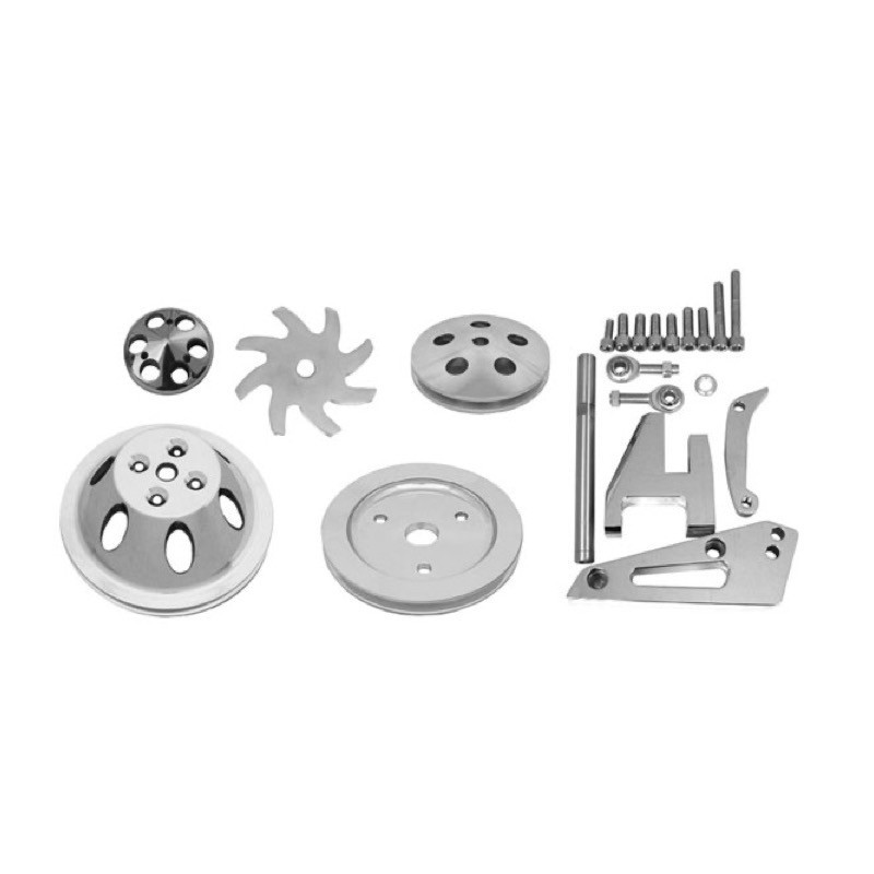Ground Up's Cutlass show quality pulley and bracket sets make finishing off your project easy. This kit includes a single groove water pump pulley, a single groove crank pulley, a single groove alternator pulley and fan, a single groove power steering pulley, and a billet aluminum bracket kit.
