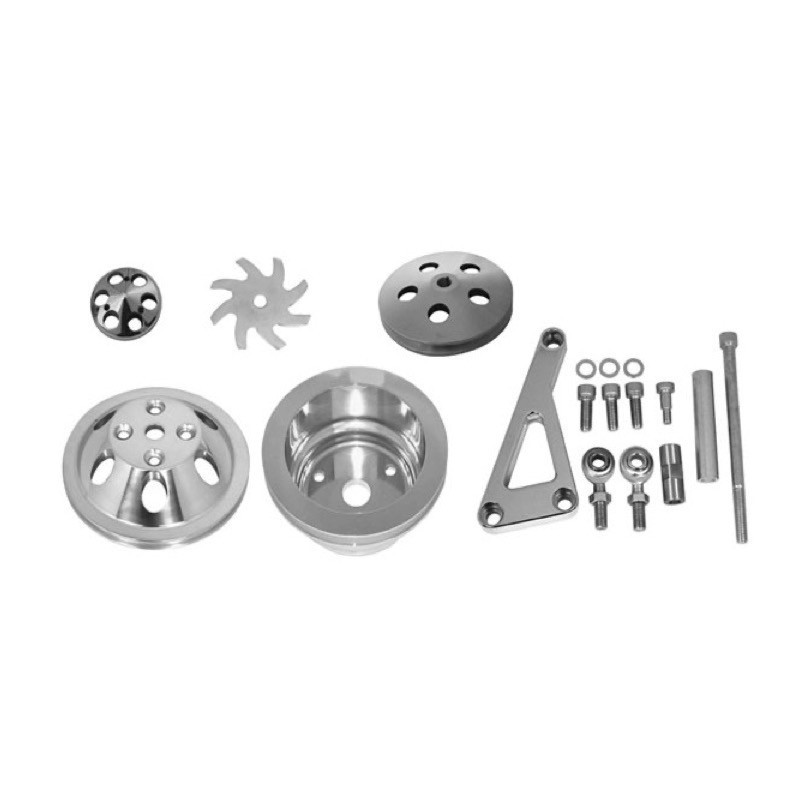 Ground Up's show quality pulley and bracket sets make finishing off your project easy. This kit includes a single groove water pump pulley, a single groove crank pulley, a single groove alternator pulley and fan, a single groove power steering pulley, and a billet aluminum bracket kit.