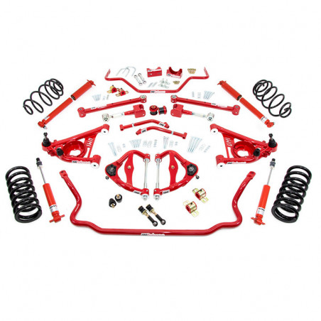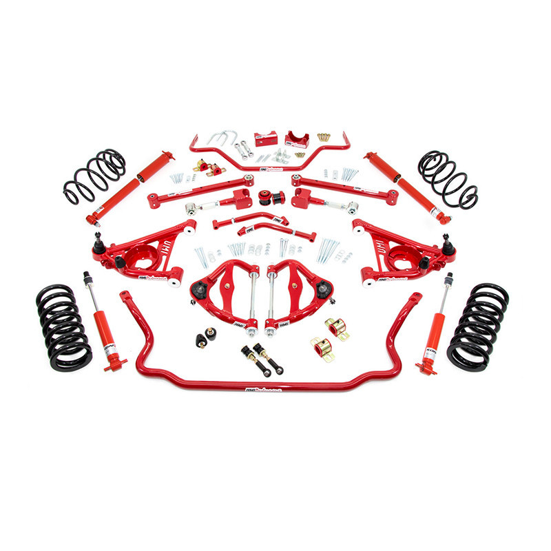 UMI's Stage 3.5 kit is designed to transform your Cutlass from a grandma cruiser to a capable corner carver with the twist of the wrist. UMI's lowering springs form the handling foundation and are controlled by UMI's premium rebound adjustable shocks. Our ultra-premium springs feature carefully tuned rates and high quality construction to eliminate the floating feeling and will tie your Cutlass directly to the road. The UMI monotube shocks rebound adjustment allows you to fine tune your ride whether you're doing back road heroics or shaving that last tenth of a second between the cones. UMI a-arms feature tubular construction, Delrin bushings for precise steering and caster corrected uppers. The 1/2 inch taller upper ball joints work with the lowering springs to tune up the poor factory Cutlass camber curve. Out back the UMI trailing arms feature Roto-joints for smooth articulation combined with poly bushings for a smooth ride. Adjustable uppers allow for pinion angle tuning while the new pro-tour bar performs on the street, during cornering and even a dragstrip blast. The entire package is designed and manufactured by UMI in Philipsburg, PA - USA of US materials and we're proud to drive on and race what we build.Features:Increased spindle height by 1/2 inch via tall upper ball joints for improved camber gain and a better contact patch. Works nicely in conjunction with lowering springsUpper a-arms add caster for improved steering feel and straight line stabilityLower a-arms feature UMI-built Delrin bushings, premium ball joints and bump stops1-1/4 inch front sway bar for flat cornering, CNC bent from 4140UMI shocks feature monotube construction and rebound damping adjustment. Rebound adjustment tuning improves handling and responsivenessUMI springs feature ultra premium CrSi material with linear rates front and rear for consistent handling (600lb/in. front, 130lb/in. rear)Rear trailing arms feature Poly and Roto-Joints as well as adjustable uppers for setting pinion angle and rear lateral locationRoto-Joints allow smooth articulation for improved handling and less bind1 inch diameter rear Pro-Tour sway bar offers tuneable rear roll resistance and less binding for street, corner carving or light drag and is balanced well with our 1-1/4 inch front bar and spring ratesEntire kit is designed and built in the USAUMI Stage 3.5 Handling Kit Includes:UMI rebound adjustable monotube shocks2 inch lowering springs, linear spring rates (600lb/in. front, 130lb/in. rear)Tubular front lower a-arms with Delrin bushingsTubular upper front a-arms with Delrin bushings & 1/2 inch taller ball jointsHeavy duty 1-1/4 inch front sway bar with new bushings & endlinksTubular & adjustable 1 inch pro-touring rear sway bar, chassis mounted designRear lower control arms feature Roto-Joint & polyurethane combinationAdjustable rear upper control arms with Roto-JointsHeavy duty frame braces with new high grade hardwareReplacement polyurethane rear end housing bushingsNew grade 8 proper mounting hardware