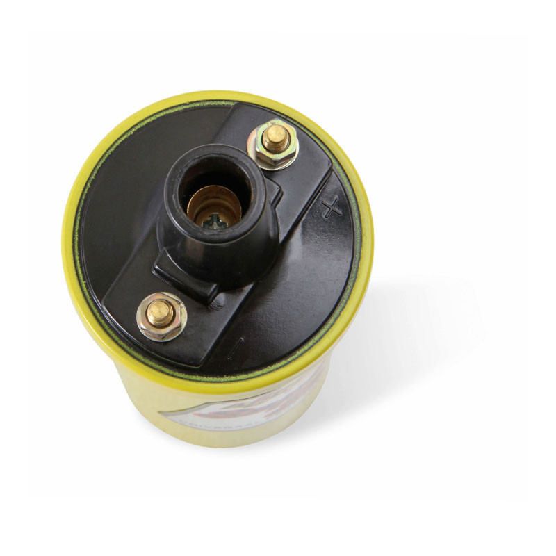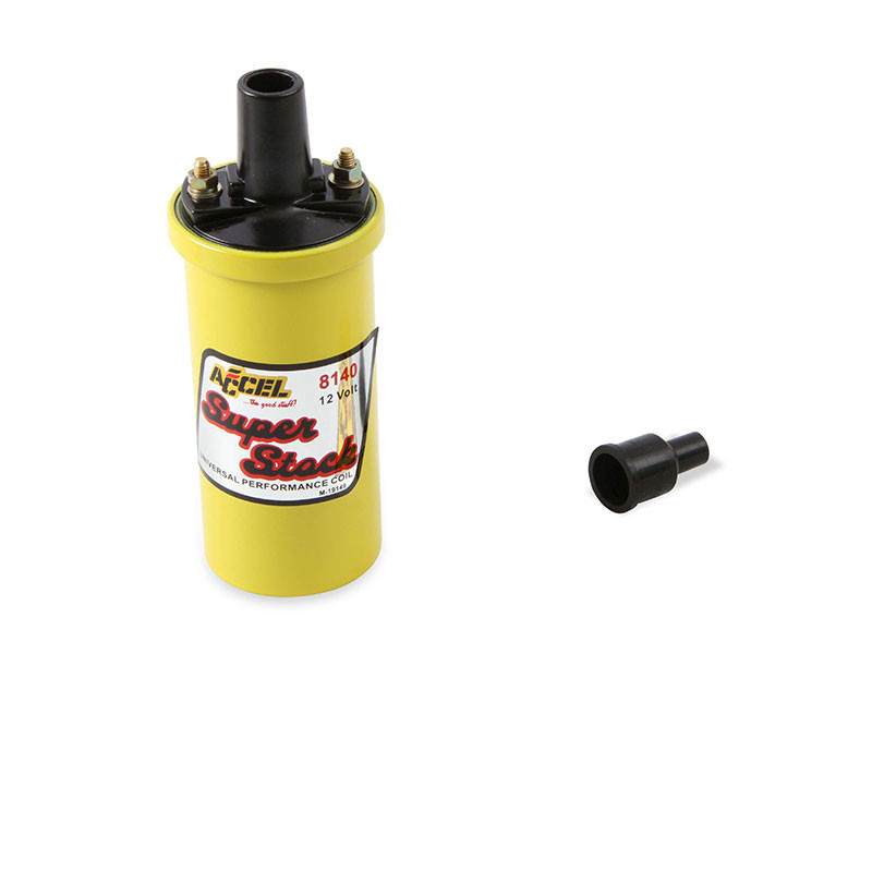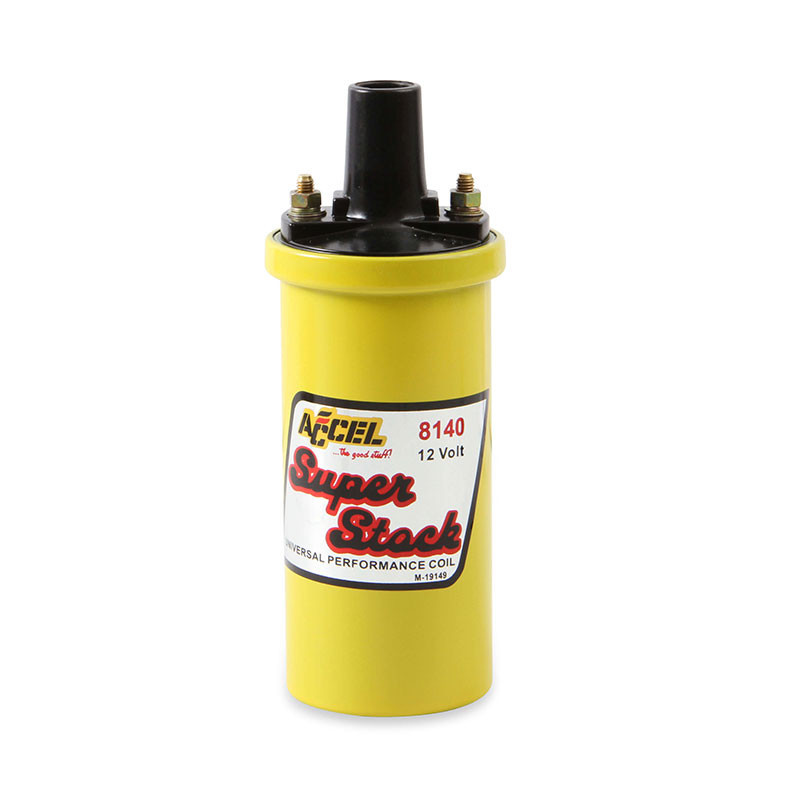 Excellent high performance replacement for El Caminos with canister type oil filled coil. Re-engineered windings for even higher energy output resulting in quicker starting improved throttle response and more high RPM power. Designed to work with Points style and Breakerless electronic ignition systems. Heavy duty black Alkyd tower provides in flashover in protection to primary terminals. ACCEL Yellow can. 42000 volts effective up to 6500 RPM 1.4 ohms on the primary.Features:42000 VoltsEffective To 6500 RPM
