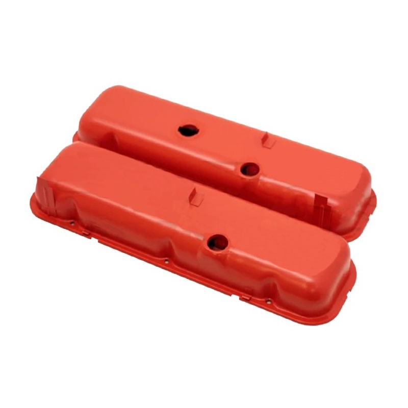 1964-1987 El Camino big block OEM style painted orange steel valve covers fit Gen 4 396-427-454 big block engines. These covers are baffled OEM Tall style and do not have dripper rails. Height: 2-3/4 inches.