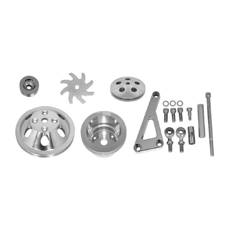 Ground Up's show quality pulley and bracket sets make finishing off your project easy. This kit includes a double groove water pump pulley, a double groove crank pulley, a double groove alternator pulley and fan, a single groove power steering pulley, and a billet aluminum bracket kit.