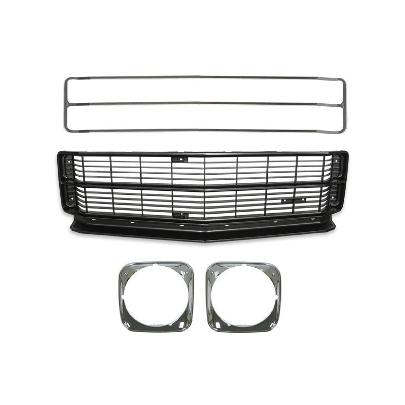 Since replacing just the grille or only a couple of moldings will make the not so good ones stand out like a sore thumb, replacing the grille and all moldings with these high quality reproductions is an excellent idea! This kit includes (1) grille, (3) center grille moldings, (2) outer grille moldings, and (2) headlamp bezels for a complete refreshening of your front end! Not only does it include everything you need, it also saves you a ton of money rather than buying all of the pieces individually over time!Kit Contains:(1) Headlamp Bezel Set(1) Grille Molding Kit Complete(1) Grille Black