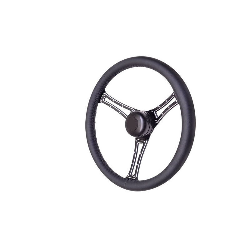 This modular designed wheel is a beautifully handcrafted masterpiece which projects the true spirit, look and feel of Pro-Touring competition. It features a black genuine leather 'baseball stitch' with finger grips. A special tiered spoke design, anodized (black/silver/black) creates a look and dimension with a unique 'slot shape' unlike anything you've ever seen. The tiered 6061 aluminum spoke is set off and fastened by unique genuine aircraft rivets. The modular spoke design was created to allow you the flexibility to remove the spokes from the grip and have the grip custom wrapped by an upholstery shop to match your vehicles interior perfectly. Shown with horn button #21-1004 horn button (sold separately) which features GT's exclusive 'Sure-Lock' O-ring design that ensures the horn button does not pop off in the middle of the night! This wheel has a three bolt mounting pattern and can be used with any of the GT3 bolt installation hubs and GT3 horn buttons. 15 inch diameter, 2 inch dish. This wheel has a three bolt mounting pattern and is interchangeable with any standard three bolt hub or horn button.