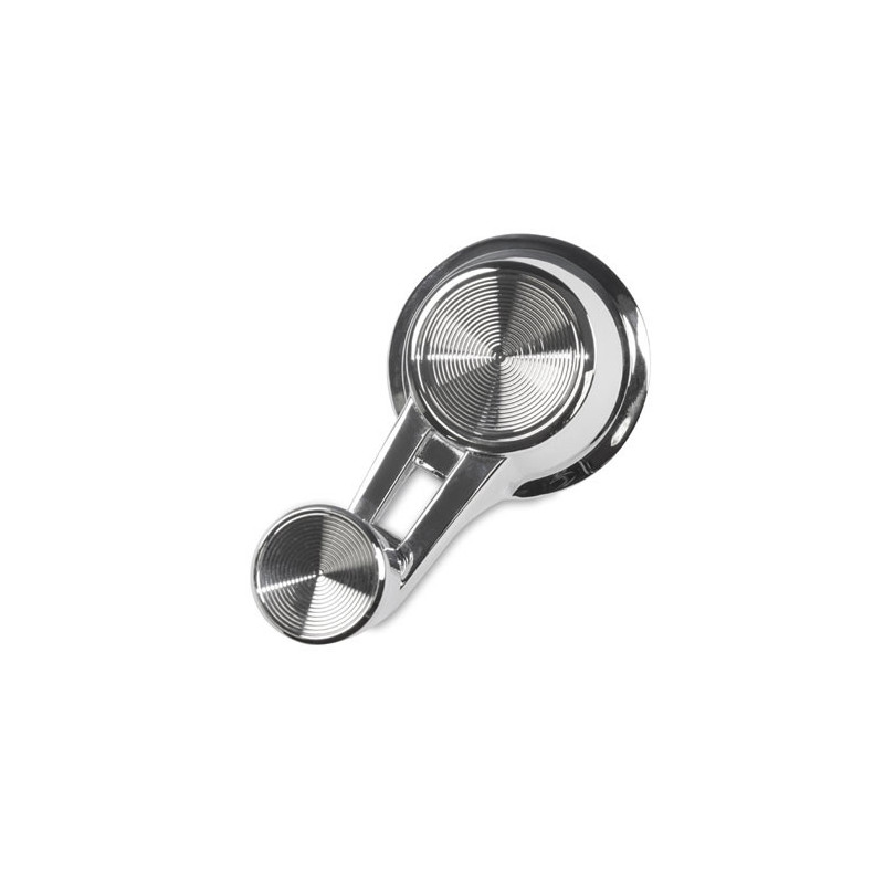 1966 El Camino reproduction vent window crank handle. Manufactured in die-cast zinc featuring a chrome finish and a chrome knob that replicates the original GM handle in quality and fitment. Can be used used as a service replacement for 1966 models if a chrome knob is preferred. Chevrolet passenger car handles originally featured a black knob. Includes C-clip for installation.