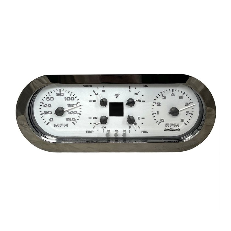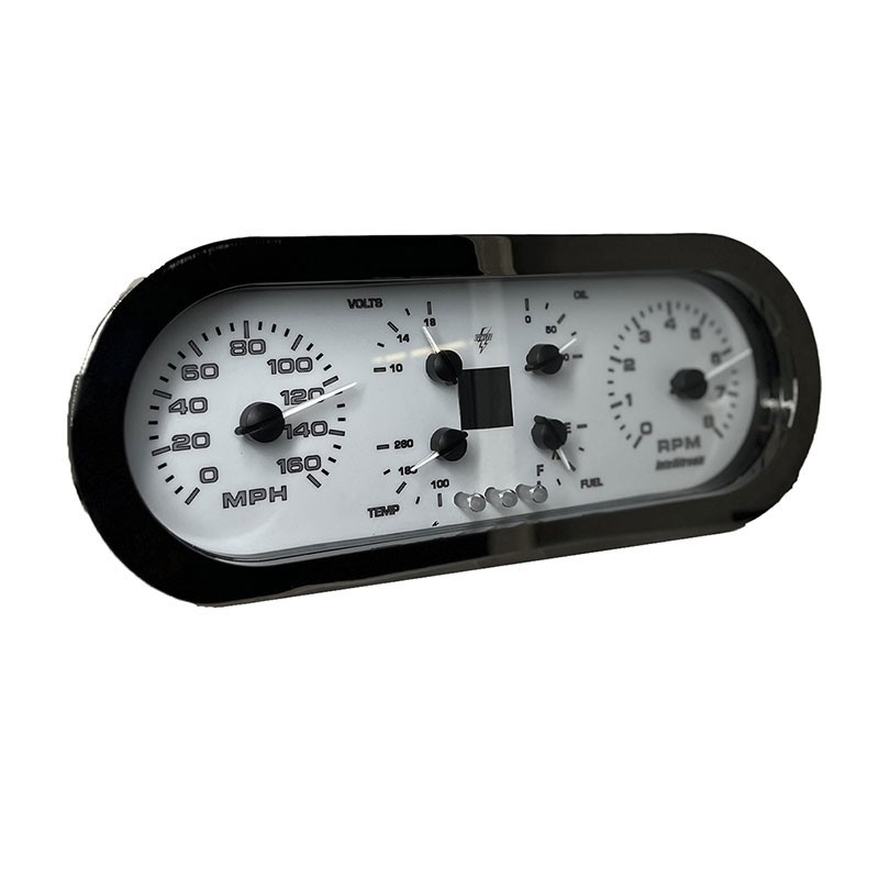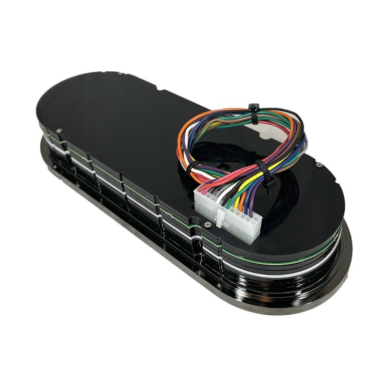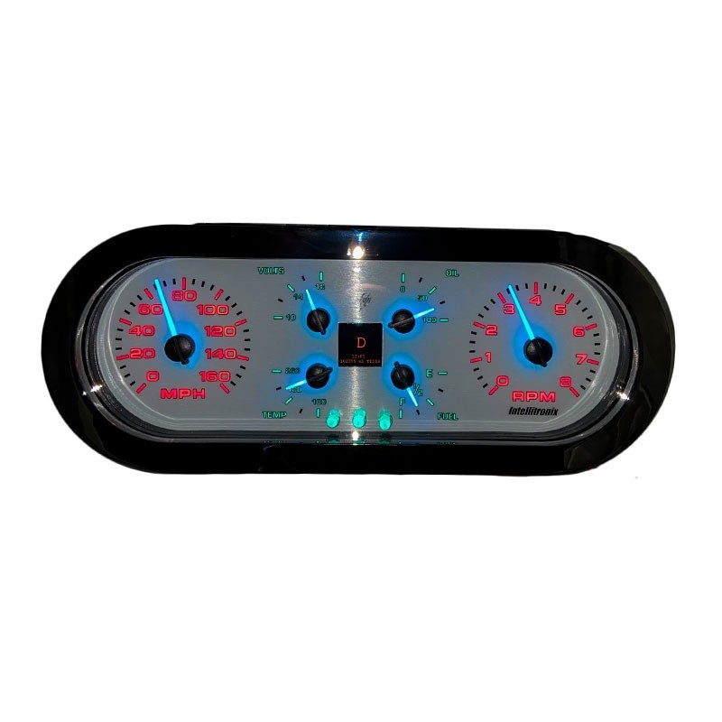 Experience the fusion of aesthetics and functionality with the AURORA - a color changeable universal analog panel! This is not just a dashboard; it is a statement that speaks volumes about your love of your vehicle! An incredible touch for any fab/restro mod project and direct fit replacement for the Chevy II El Camino. The Aurora has a white polycarbonate sub surface overlay with brush stroke finish with your choice of chrome or black chrome bezel. Speed, oil pressure and temperature senders included. 30 standard color options, every gauge and needle are adjustable. Comes with a preprogrammed demo mode and 20 custom themes (1-15 are pre-established, 16-20 are available for custom editing). Digital readout can be selected from any of the 6 needle gauges, plus clock, odometer, tripmeter, check engine, turn signals, high beam, parking brake, high speed recall, 0-60 time and _ mile time, and can display a gear indicator (with a gear indicator kit, sold separately).Included:Speedometer, Tachometer, Fuel Gauge, Voltmeter, Oil Pressure Gauge, Water Temperature Gauge.Menu functions:Menu functions - demo program, adjustable brightness, dash color, text color, custom dash themes, needle colors, MPH calibration, cylinder selection, fuel ohms selection.Features:1.27 inch color TFT screen display.Speedometer reads up to 160 MPH and works with any mechanical or electronic transmissions.Tachometer reads from 0 to 8000 in 100 RPM increments, selectable cylinder modes (1-16)Voltmeter with adjustable calibration reads from 10.0V to 18.0V.Oil Pressure gauge displays from 0-100 PSI.Water Temperature gauge reads from 100 to 260 degrees FahrenheitFuel Level gauge includes a list of common selectable fuel ranges or enter a custom range.Automatic nighttime dimming.All required sending and sensor units are included.AMERICAN MADE - LIFETIME WARRANTY