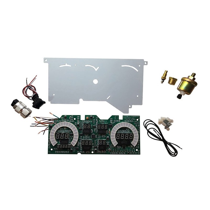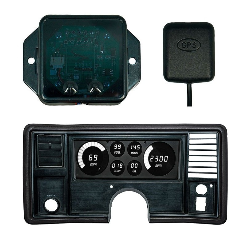 Feel the wind in your hair riding in your 1978-1987 El Camino with a state-of-the-art LED digital replacement gauge panel with GPS from Intellitronix. This dash comes with direct fit printed circuit boards, custom fit smoked plexiglass faceplate, universal water temperature S8013, oil pressure S8434, and speedometer S9013 sending units including sender and sensor for vehicles without electronic transmission or cruise control, and instructions for installation. Features:Speedometer reads up to 255 mph and includes odometer, trip meter, one button calibration, 0-60 time, _ mile elapsed time and high-speed recall.Tachometer displays 0-9999 RPM in 100, 10, or 1 RPM increments (ex. 9900, 9990, 9999). Fully programmable for 1-2-4-6-8-10-12-cylinder engines.Water Temperature displays a range of 18-255°F.Oil Pressure shows a range of 0-99 PSI.Voltmeter displays 7.0-18.0 volts range. No sending unit requiredFuel Level reads 0-99% range in 1% increments. User programmable to work with Ford, GM, Chrysler, VDO, and aftermarket 240-33 ohm industry standard fuel senders.The panel features turn signals, high beam indicators and parking brake.