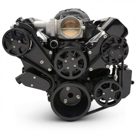 Eddie Motorsports' S-Drive 6 rib serpentine pulley kits for El Camino include everything to accessorize your LS Chevy engine. Kits come complete with all of the necessary precision CNC machined billet aluminum brackets & pulleys, which are made in the USA, as well as high quality, name brand components; Tuff Stuff aluminum water pump, Sanden compact AC compressor, Maval power steering pump with attached aluminum reservoir, Powermaster 170 amp alternator, SFI approved balancer. Matte Black Fusioncoat finish.