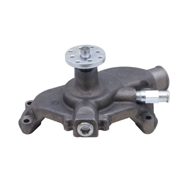 Short style water pump for Small Block Chevy, cast finish, cast iron housing, premium quality center shaft, bearings and seal for long term dependability, 5/8 inch hub pilot, 5.659 inch hub height. Super Cool impeller provides 30% more cooling flow over stock water pumps.