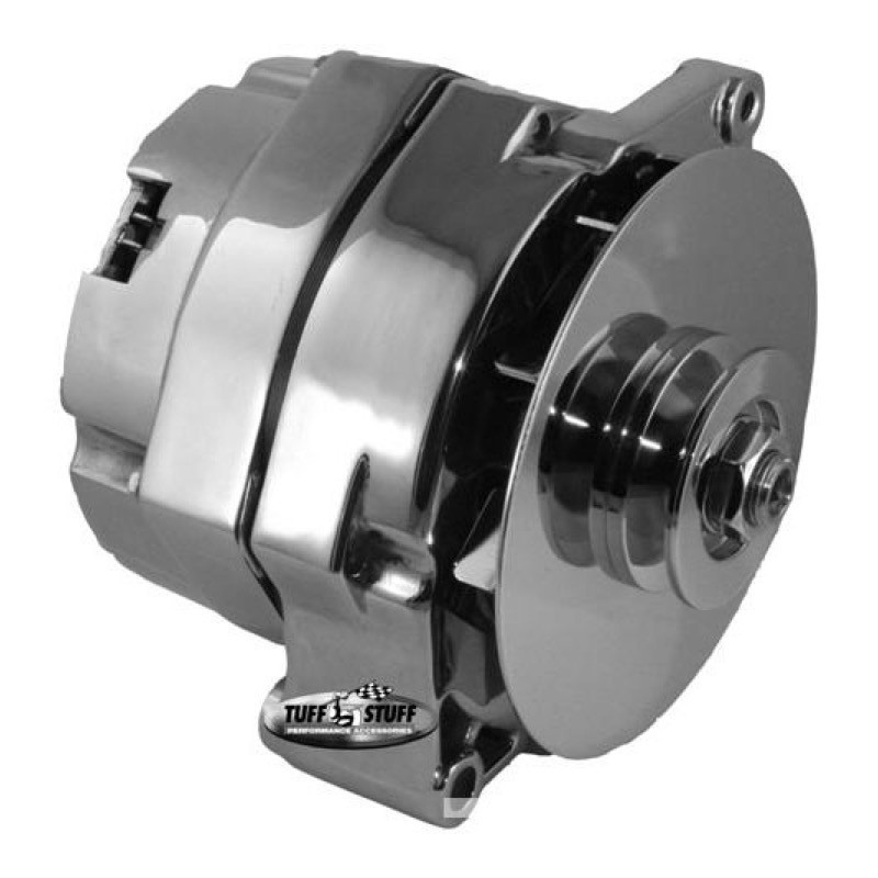 GM 10DN alternator, 100 amp, external regulator, chrome finish, external cooling fan, V groove pulley, accepts OEM wiring, and spike resistant diodes. Tuff-Tested to our rigorous standards.
