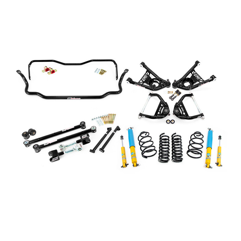 SMALL BLOCK MOTORS, PONTIAC 400 OR BIG BLOCK WITH ALUMINUM HEADS AND INTAKE TEND TO SIT LEVEL WITH THIS KIT. LIGHTWEIGHT LS MAY REQUIRE SPRING TRIMMING. AN ADDITIONAL 1/4 INCH FRONT END DROP MAY OCCUR ON VEHICLES WITH FULL WEIGHT BIG BLOCK ENGINES.