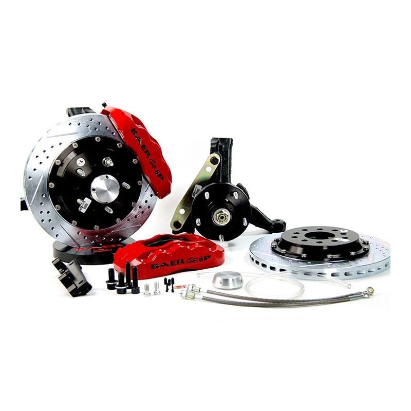 If you are looking for some serious stopping power for your 1978-1987 G-body, Baer brakes has you covered! This system features the 6-piston, 6P caliper mounted to a 13 inch, 2 piece slot, drill, zinc plated rotor. The 6P caliper has D.O.T compliant dust and weather seals and uses the popular D0731 pad type. Billet aluminum hubs come assembled with premium bearings packed with Redline synthetic grease and billet dust caps. Rotors are pre-assembled with NAS high grade stainless hardware. All mounting brackets, stainless braided hoses and hardware are included and comes assembled on modified drop spindles. The 13 inch Pro+ is designed to fit most 17 inch or larger wheels. Rotor Style:13 X 1.1 Inch 2-piecePiston Count: 6 PistonPad Type:(D0731R)Minimum Wheel Size:17 inch or largerIncludes:Calipers, Brake pads, Rotor and Hat assemblies, Billet aluminum hubs w/premium bearings, Billet dust caps, Modified drop spindles, Brackets, Stainless braided brake hoses and all mounting hardwareNotes:System comes completely pre-assembled on 2 inch drop spindlesApplications:1978-1987 GM G-Body cars Kit Features:6-piston, 2-piece caliper with six, 3/8 inch cross bolts for added strengthStainless steel abutments and noise suppression springsStaggered piston sizes to minimize pad wearUses the C5 and C6 backing plate (1978-1987 Corvette) or the FMSI part number D731Uses correct banjo style fittings, Baer does not use any pipe threadIncludes a set of modified spindles and comes pre-assembled ready for installationStainless braided hoses included100% MADE IN USA with US sourced material>