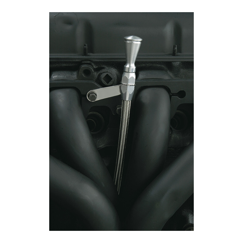 Flexible Engine Oil Dipstick designed with billet aluminum handle to coordinate with Lokars Flexible Transmission Dipstick(sold separately). Slim design allows mounting inside headers. Designed for use with factory or block hugger headers. E-Z to read flexible inner dipstick measuring cable for accurate measure of engine oil.