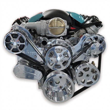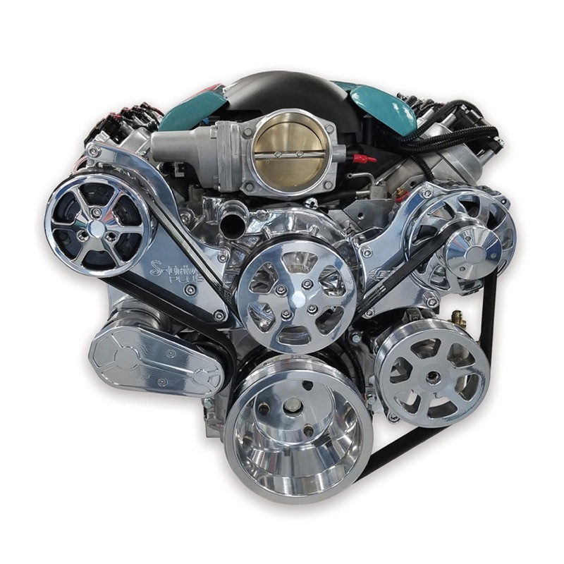 S-Drive + Eight rib pulley systems for Grand Prix have a contact patch that is 33% wider than a standard six rib belt, the eight rib improves belt traction which limits slippage in higher horsepower applications and can handle increased torque loads of 33%. The larger eight rib belt also greatly reduces the chances of Span Vibration(belt whip/belt waves) which will have an improved life. The drive system's brackets and pulleys are CNC machined from high quality aluminum. Serpentine Drive Plus pulley systems also include all of the necessary stainless steel fasteners as well as the highest quality, name-brand components including Edelbrock/Tuff Stuff water pumps, Powermaster alternators, Gates tensioner and serpentine belts, Sanden style A/C compressors, and Maval power steering pumps. Complete system with air conditioning, 140 amp alternator, Aluminum Water pump, and a Maval power steering pump for use with remote reservoir (sold separately). Gloss black anodized finish.