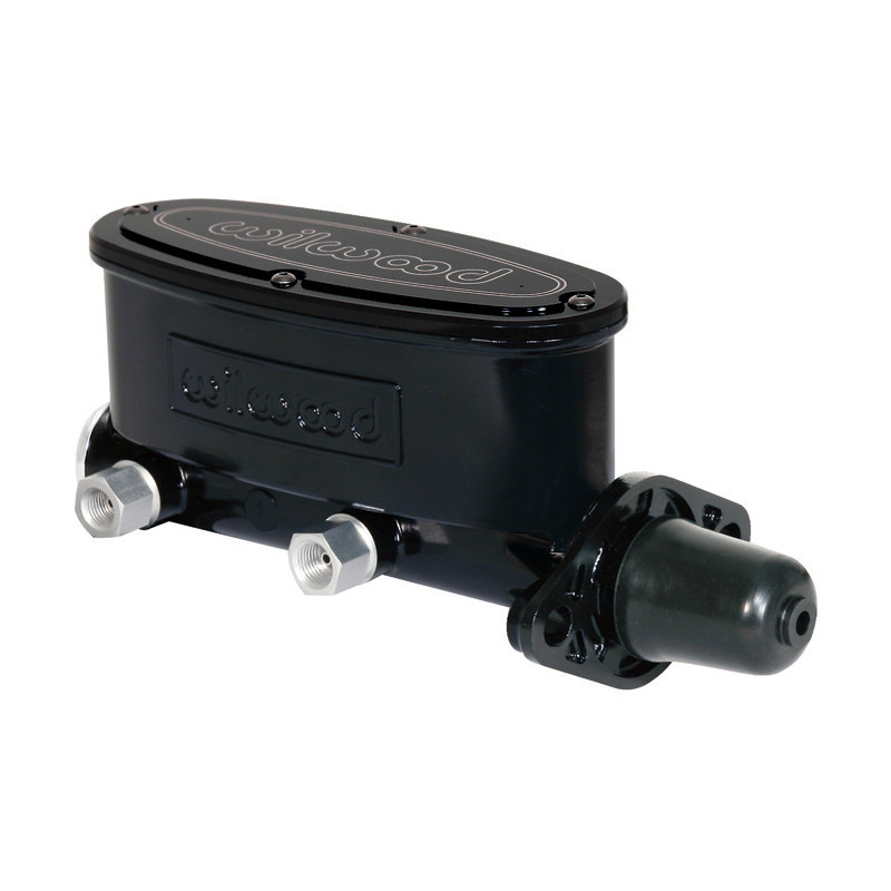 Wilwoods Tandem Aluminum Master Cylinder with Black E-Coat finish and 1 inch bore can be used in manual and power assisted applications. It is designed for mount flanges from 3.22 inches to 3.40 inches, common measurements for most domestic cars and trucks from the mid 1960s to present, and offer fluid outlet ports on both sides of the bore. The stroke is set at 1.10 inches with a volume ratio of 2:1 between the primary and secondary chambers. Machined from high-pressure die castings, each master cylinder weighs only 3lbs, a 75 percent weight savings over most cast iron OE type master cylinders.