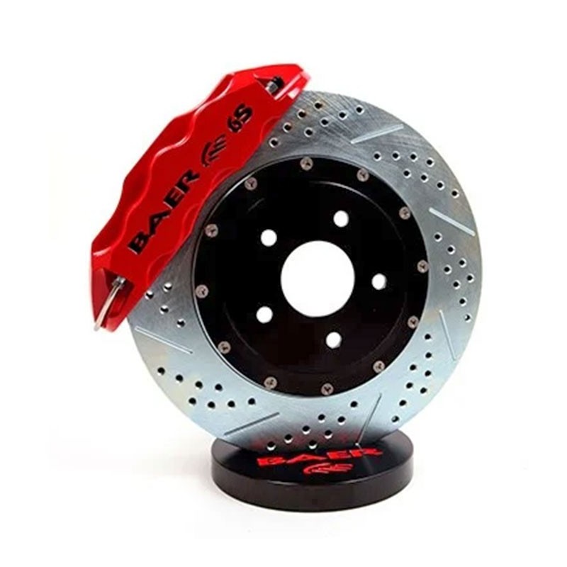 If you are looking for some serious stopping power for your 1978-1983 G-body, Baer brakes has you covered! This system comes standard with the monoblock 6-piston, 6S caliper mounted to a 14 inch, 2 piece slot, drill, zinc plated rotor. The 6S calipers have dust and weather seals and uses the popular D1247 pad type. Rotors are pre-assembled with NAS high grade stainless hardware. Billet aluminum hubs come assembled with premium bearings packed with Redline synthetic grease and billet dust caps. All mounting brackets, stainless braided hoses and hardware are also included and comes assembled on modified drop spindles. The 14 inch Extreme+ fits most 18 inch or larger wheels. Rotor Style:14 X 1.25 Inch 2-piecePiston Count: 6 PistonPad Type:(D1247)Minimum Wheel Size:18 inch or largerIncludes:Calipers, Brake pads, Rotor and Hat assemblies, Billet aluminum hubs w/premium bearings, Billet dust caps, Modified drop spindles, Brackets, Stainless braided brake hoses and all mounting hardwareNotes:System comes completely pre-assembled on 2 inch drop spindlesApplications:1978-1983 G-body Kit Features:6-piston,1-piece Monoblock design machined out of a US made 2618 aluminum forgingInternal crossover designStainless steel pistons, abutments and noise suppression springsStaggered piston sizes to minimize pad wearUses the common D1247 (DR11) race pad backing plate shared by many other competition calipersUses correct banjo style fittings, Baer does not use any pipe threadIncludes a set of modified spindles and comes pre-assembled ready for installationStainless braided hoses included100% MADE IN USA with US sourced material>