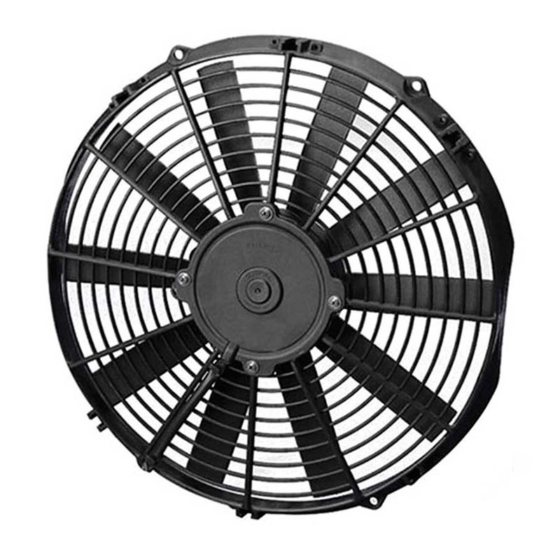 SPAL electric fans and accessories are built to meet the most rigorous cooling requirements needed for today's high performance automotive applications. SPAL fans are durable, reliable, and the choice of many NASCAR teams. SPAL offers a variety of high performance fans perfect for your motorcycle, ATV, automotive, and/or oil cooler applications. Manufactured from sturdy plastic, individually balanced for long service life, and most feature a fully sealed waterproof/dust proof motor for reliable performance in the most extreme conditions. SPAL fans can be mounted to any radiator with universal brackets and shrouds.Key Features:1032 CFMPull Fan DesignStraight Style BladesLow Profile Motor DesignHeight; 9.72inWidth; 13.62inDepth; 2.05inFeatures fully sealed motor to IP68 standards making them waterproof/dust proof12V